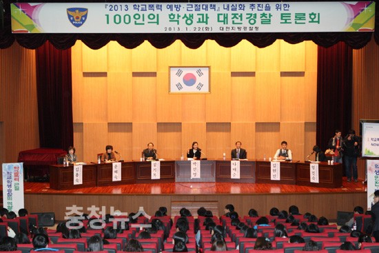 대전경찰청은 지난 22일 오후 3시 무궁화홀에서 대전지역 학생, 학부모, 교사, 교육청 관계자, NGO 등 400여명을 초청, 2012년 학교폭력 추진성과를 재조명하고 2013년 학교폭력 추진방향 설정을 위한 토론회를 개최했다.