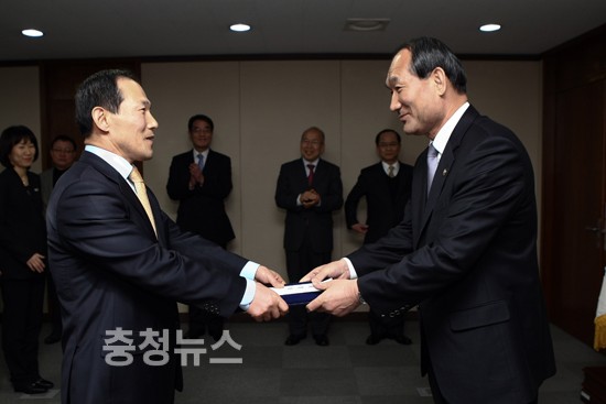 ▲ [국가보훈처 5층 로비에서 신영교 대전지방보훈청장(사진 왼쪽)이 박승춘 국가보훈처장(사진 오른쪽)에게 2012년도 성과평가 최우수기관 표창과 포상금을 수여받고 있다]