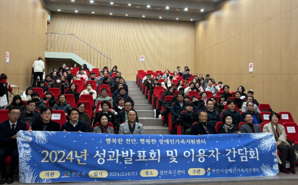 [충청뉴스 최형순 기자] 천안시장애인가족지원센터(센터장 계형국)에서는 2024년 성과발표회 및 간담회를 박상돈 천안시장, 김행금 천안시의장등 150여명의 참여자와 함께 12월 14일(토) 천안축구센터에서 성황리에 진행되었다.