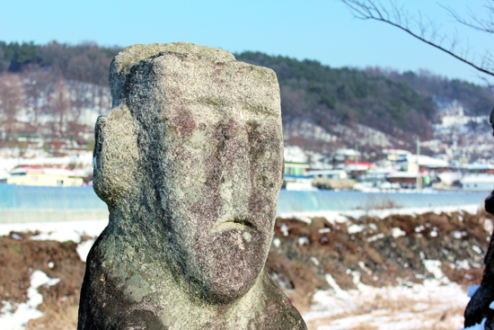 “말도 마. 어마어마했지. 내가 어릴 땐데 해방 직후니까 1946년~7년쯤 되나보네. 장마가 와서 온 동네에 물난리가 났었어. 그때 장승이 같이 떠내려간 겨. 겨우 주워다가 저쪽(지금 위치에서 아랫마을 쪽으로 길 건너 대각선)에 심어놨었어. 그러다가 또 길을 새로 포장한다고 해서 지금 자리로 옮겼지.” 그러면서 이택우 할아버지는 할아버지 장승이 지금보다 컸었다는 얘기도 했다.
