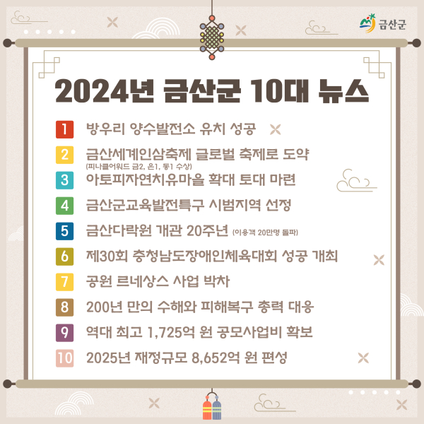 선정된 뉴스를 살펴보면 △방우리 양수발전소 유치 성공 △제42회 금산세계인삼축제 글로벌 축제 도약 △아토피자연치유마을 확대 토대 마련 △금산군교육발전특구 선정 △금산다락원 20주년 △제30회 충남도장애인체육대회 성공 개최 △공원 르네상스 사업 박차 △200년 만의 수해와 피해복구 총력 대응 △역대 최고 1725억 원 공모사업비 확보 △2025년 재정규모 8652억 원 등이다.