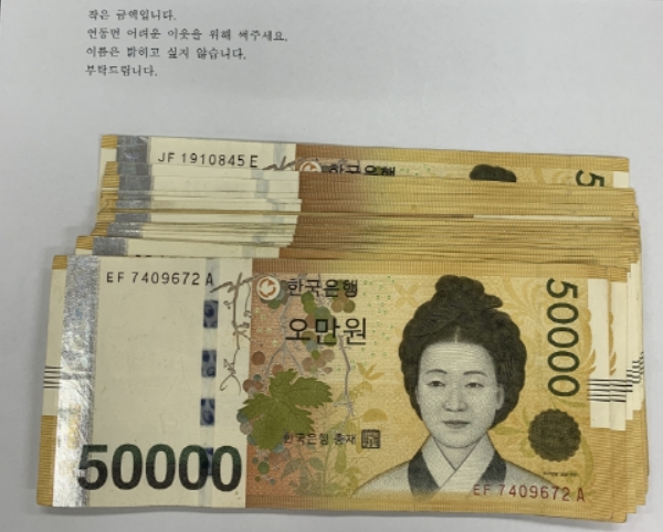 이름을 밝히지 않은 기부자는 짧은 편지에서 “작은금액이지만 연동면의 어려운 이웃을 위해 써주셨으면 한다”라며 “이름은 밝히고 싶지 않다”라고 전했다.