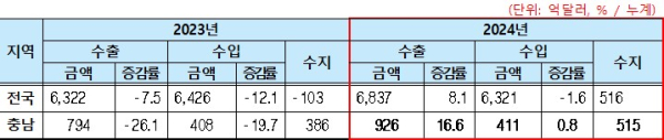 충남은 2023년 무역수지 흑자액이 385억 7200만 달러로, 울산(423억 1500만 달러)에 뒤지며 1위 자리를 잠시 내줬다.