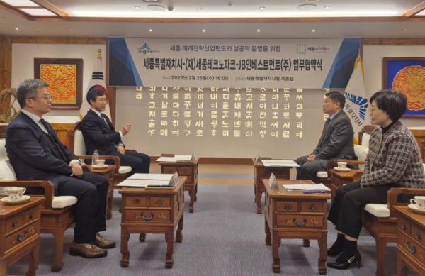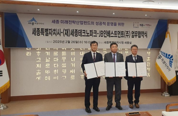 시는 26일 (재)세종테크노파크와 JB인베스트먼트㈜간 ‘세종 미래전략산업펀드의 성공적 운영’을 위한 업무협약을 체결했다.