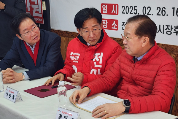 [충청뉴스 박동혁 기자] 권영세 국민의힘 비상대책위원장은 26일 4·2 재보궐선거를 앞두고 전만권 아산시장 예비후보를 만나 "당선 후 첫날부터 아산을 위해 뛸 분"이라며 "아산 발전시킬 적임자"라고 치켜세웠다.