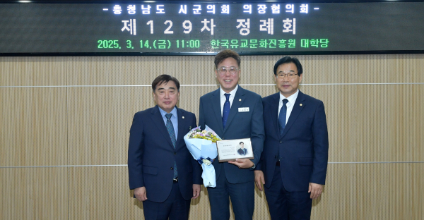 [충청뉴스 논산 = 조홍기 기자] 논산시의회 김종욱 의원이 14일 한국유교문화진흥원(논산시 노성면 소재)에서 열린 「제129차 충남 시·군의회 의장협의회 정례회」에서 ‘충남의정봉사대상’ 수상의 영예를 안았다.
