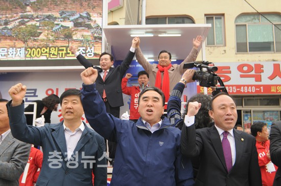▲ 이인제 의원이 이완구 후보의 지원 유세장에는 논산출신 송영철 전도의원 태안출신 강철민, 당진출신 이종현 도의원이 이 후보를 연호하고 있다