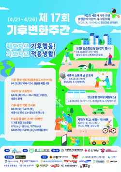 [충청뉴스 최형순 기자] 세종시는 ‘제55주년 지구의 날(22일)’을 맞아, 오는 21일부터 26일까지 ‘제17회 기후변화주간 행사’를 개최한다.