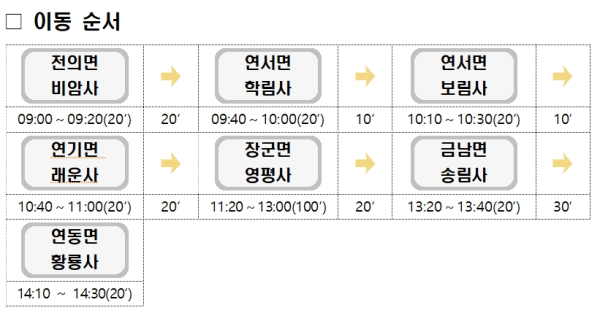 오후에는 금남면 송림사와 연동면 황룡사를 방문하여 봉축 법요식에 참석하고 신도들과 함께 부처님의 자비와 평화를 기리는 시간을 가질 계획이다.