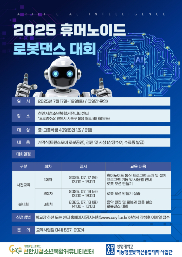 [충청뉴스 유규상 기자] (재)천안시청소년재단(대표이사 한상경) 천안시청소년복합커뮤니티센터는 오는 19일, 지역 중·고등학생 40명이 참가하는 「2025 휴머노이드 로봇댄스 대회」를 개최한다.