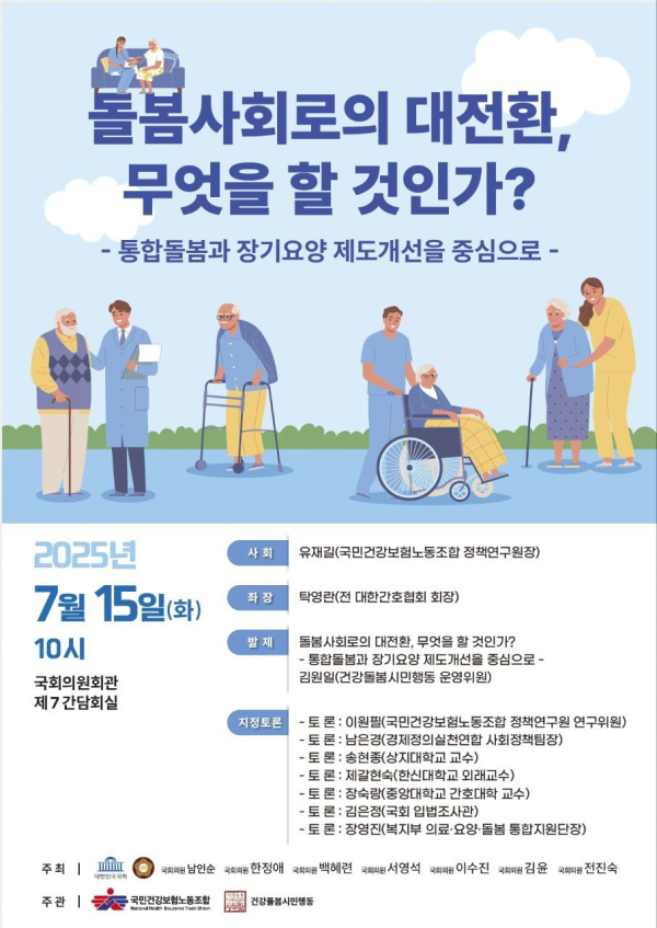 이에 더불어민주당 남인순, 한정애, 백혜련, 서영석, 이수진, 김윤, 전진숙 국회의원과 국민건강보험노동조합(위원장 황병래), 건강돌봄시민행동은 오는 7월 15일(화) 오전 10시부터 12시까지 국회 의원회관 제7간담회실에서 ‘돌봄 사회로의 대전환’을 위한 국회 토론회를 공동 주최한다.