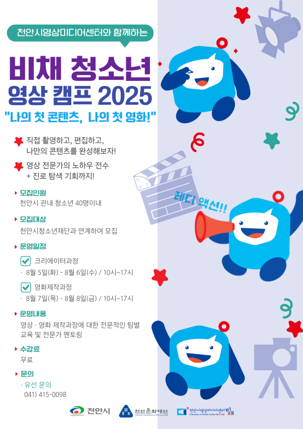 캠프는 무료로 운영되며, 세부내용은 천안문화재단 영상미디어팀(041-415-0098)으로 문의하면 된다.