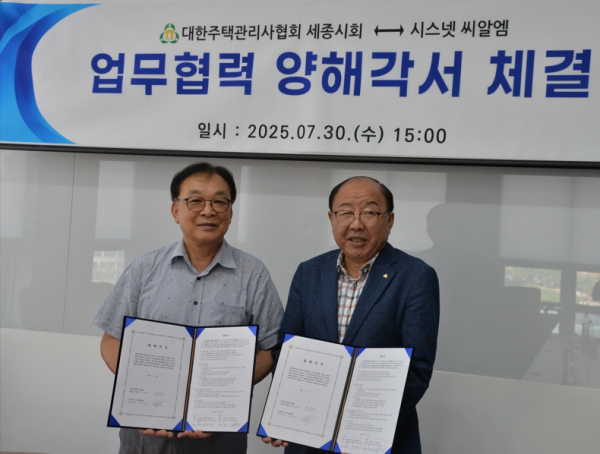 [충청뉴스 최형순 기자] 대한주택관리사협회 세종시회(회장 박상희)와 국내 유일의 멀티플랫폼 서비스 기술을 보유한 ㈜시스넷씨알엠(대표 조규영)이 30일 전략적 업무협약을 체결하고, 아파트 소모품 플랫폼 운용을 통해 공동주택 관리의 질을 높이는 데 협력한다.