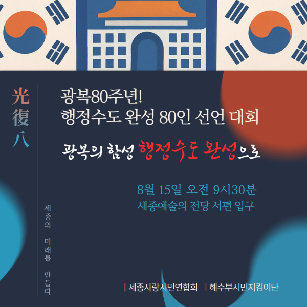 한편, 세종사랑시민연합회와 해수부시민지킴이단(단장 박윤경)은 같은 날 오전 9시 세종예술의전당 서편 입구에서 '광복 80주년 행정수도 완성 80인 선언대회'를 개최한다.