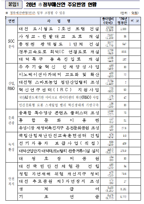 대전시는 이장우 시장을 비롯한 간부진이 중앙부처와 국회를 수차례 방문하며 대응한 결과, 핵심 교통 인프라 사업과 미래 신성장 사업, 생활밀착형 복지 사업까지 두루 성과를 거뒀다고 설명했다.