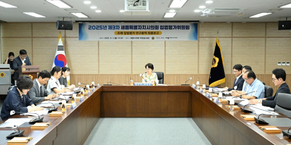 [충청뉴스 최형순 기자] 세종특별자치시의회(의장 임채성)는 1일 시의회 6층 의정실에서 ‘2025년 제3차 조례 입법평가위원회’를 열고, "올해 진행된 조례 입법평가 연구용역의 최종 결과를 심의했다"고 밝혔다.