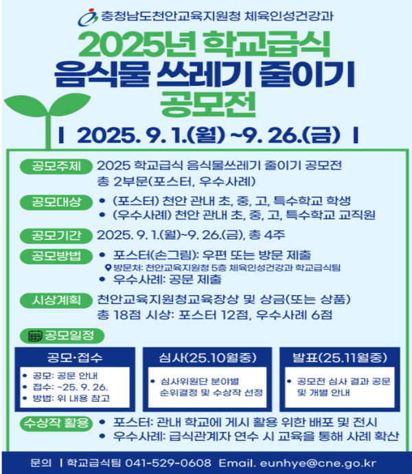 [충청뉴스 유규상 기자] 천안교육지원청(교육장 차덕환)은 9월 1일부터 26일까지 4주간 ‘2025 학교급식 음식물쓰레기 줄이기 공모전’을 운영한다.