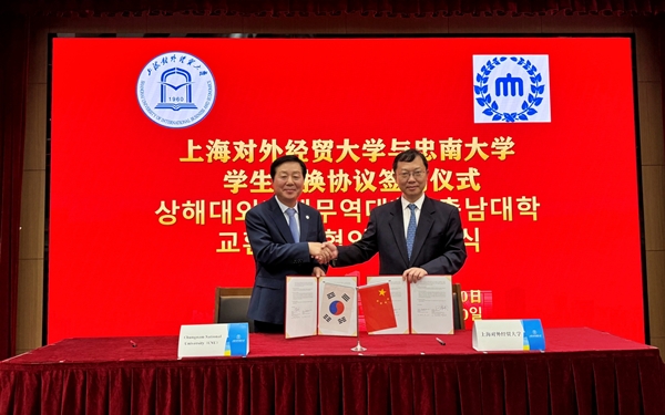 1일 충남대에 따르면 김정겸 총장단은 지난달 30일 상해대외경무대학 구베이 캠퍼스를 방문해 Wang Rongming 총장을 만나 교환학생 협정을 체결하고 ▲산학연 융합 혁신 모델 ▲우수 인재 공동 양성 ▲CAMPUS Asia 참여 가능성 등을 주제로 심도 있는 협의를 진행했다.