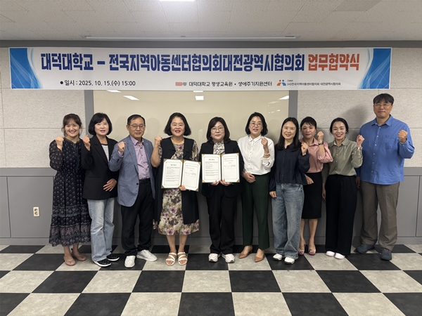 [충청뉴스 이성현 기자] 대덕대학교는 전국지역아동센터협의회 대전시협의회와 지역 아동·청소년의 성장 지원과 종사자 역량강화를 위한 업무협약을 체결했다고 16일 밝혔다.