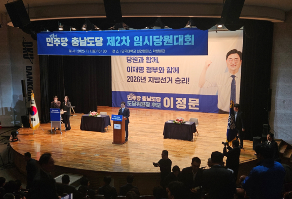 한편, 이정문 국회의원은 지난달 27일 단수로 입후보해 30일과 31일 2일간 당원들을 대상으로 찬반투표를 실시한 결과 총 선거인단 4만 7,813명 중 8.78%의 당원들이 온라인 투표에 참여, 90.61%의 찬성표를 받아 더불어민주당 충남도당위원장에 당선되었다.