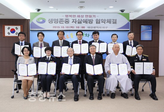서구는 10일 서구청 대회의실에서 민간복지단체, 종교단체, 행정.경찰.소방기관 대표자 13명이 참석한 가운데 '생명존중 자살예방' 협약식을 가졌다.