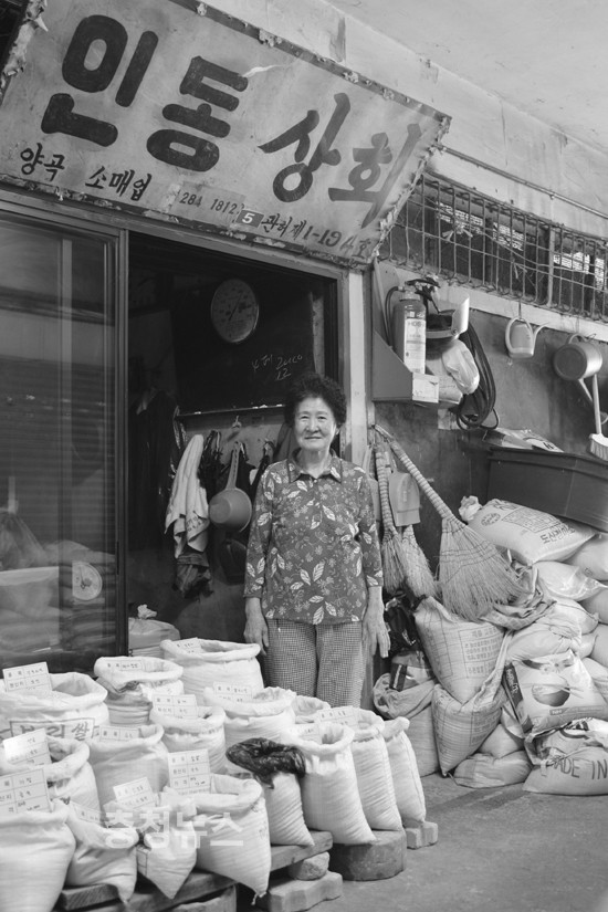 그리도 정갈한 곡물을 펼쳐 놓은 ‘인동상회’는 무척 좁다. 가게 한 켠에는 사각형 기둥도 떡 하니 박혀 있다. 칸을 쪼개고 쪼갠 한 평 남짓한 공간이다. 그 좁은 공간에서 한 사람의 인생 전부가 고스란히 담겼다. 함부로 넘나들 공간이 아니다.