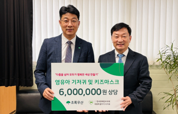 [충청뉴스 최형순 기자] 초록우산 대전세종지역본부(본부장 최승인)는 16일, 한국장애인부모회 세종시지회(회장 오상열)로부터 지역 내 아동들의 건강한 일상생활 지원을 위한 영유아용 기저귀 및 키즈마스크 등 총 600만 원 상당의 후원물품을 전달받았다고 밝혔다.
