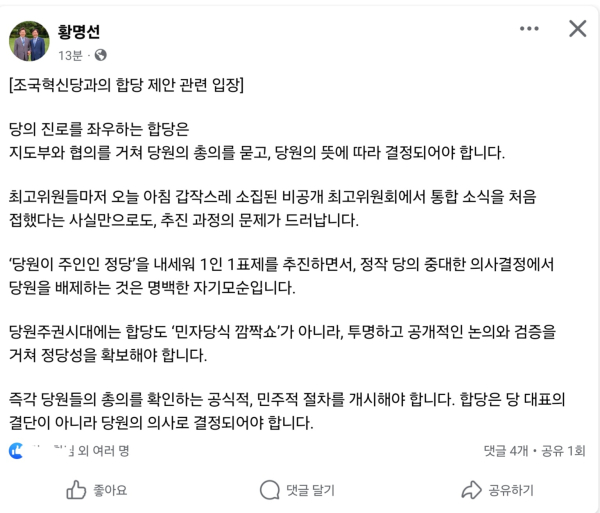 민주당 황명선 최고위원은 22일 정 대표의 ‘합당 제안’ 후 SNS에 올린 글을 통해, 정 대표의 독단적 당 운영을 비판하고 나섰다.