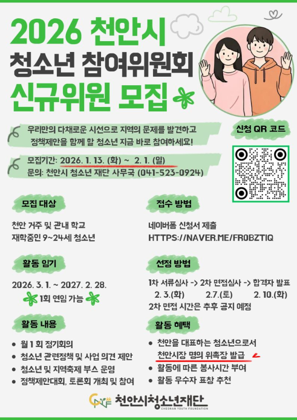 [충청뉴스 유규상 기자] (재)천안시청소년재단(이사장 김석필)은 청소년 현안문제에 대한 정책제안 활동 등에 참여할 ‘2026 천안시청소년참여위원회’위원을 오는 2월 1일까지 모집한다.