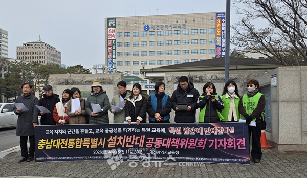 충남·대전통합특별시 설치 반대 공동대책위원회(이하 공대위)는 4일 대전교육청 앞에서 출범 기자회견을 열고 “통합특별시가 교육 주체의 목소리를 외면한 채 교육자치를 훼손하는 방향으로 설계되고 있다”고 밝혔다.