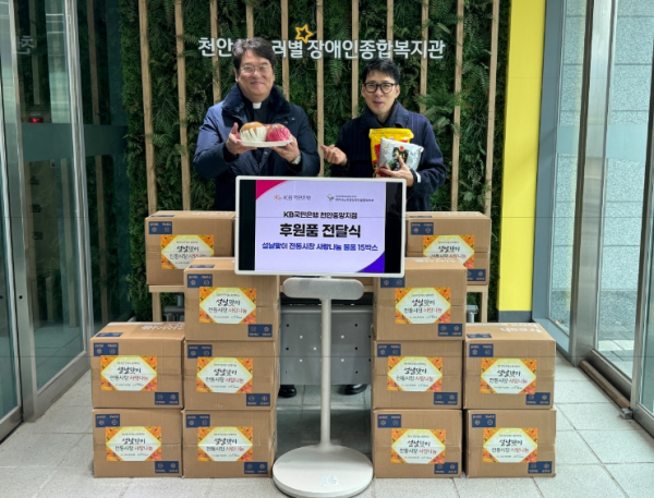 [충청뉴스 최형순 기자] KB국민은행 천안중앙지점(지점장 김훈정)이 설 명절을 앞두고 천안시누리별장애인종합복지관(관장 김경준)을 찾아 ‘설날맞이 전통시장 사랑나눔 꾸러미’를 전달하며 지역사회 나눔 실천에 동참했다.