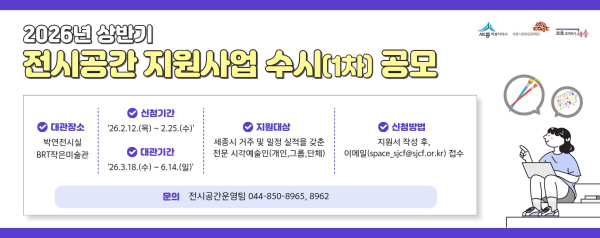 [충청뉴스 최형순 기자] 세종시문화관광재단(대표이사 박영국)은 지역 시각예술인의 창작활동을 지원하고 시민들에게 풍성한 볼거리를 제공하기 위해 ‘2026년 상반기 전시공간 지원사업 수시(1차)’ 공모를 진행한다.