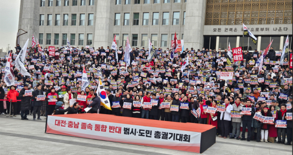 [충청뉴스 유규상 기자] 국민의힘은 24일 국회 본청앞에서 "충남대전 졸속통합 반대 범시도민 총궐기대회"를 개최하고 정부와 여당이 추진하는 통합법안에 대한 반대입장을 표명했다.