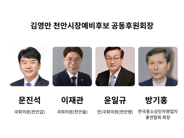 [충청뉴스 유규상 기자] 김영만 더불어민주당 천안시장 예비후보는 12일 후원회장으로 문진석국회의원(천안갑), 이재관국회의원(천안을), 윤일규 전 국회의원(천안병), 방기홍 한국중소상인자영업자총연합회장 등 4인을 공동 선임했다.