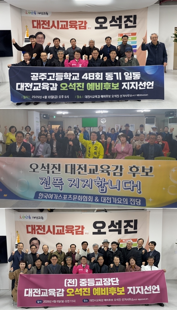 대전 전직 중등교장단 200여 명을 대표한 20명의 전직 교장들은 지지 결의문을 채택했다. 이들은 오 후보가 초·중·고 교단과 교육국장 등 행정 경력을 겸비한 실천형 전문가라는 점을 강조했다. 교육계 원로들의 지지세도 두드러진다.