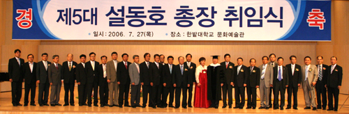 설동호 총장은 지난 4년간 NURI, RIS, 산학협력중심대학, 창업경영대학원 등 주요 국책 사업 선정, 전국 A그룹 정규직 취업률 2위, 신입생 입시경쟁률 높은 수준 도달, 한밭대의 숙원사업이었던 교직과정 및 ROTC 해결, 캠퍼스 부지 확장, 대학본부, 한밭인큐베이터타운, 산학협동관, 문화예술관 등 건물 준공 및 기공 등의 공적을 대학구성원으로부터 높게 평가 제5대 총장으로 연임하게 되었다. ▲ 학생들로부터 축하 꽃다발을 받는 설동호 총장 부부