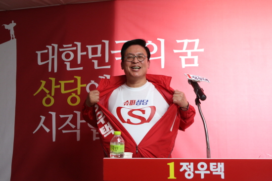 새누리당 정우택 청주 상당 국회의원 후보가 23일(수) 오전, 충북도청 기자실에서 제20대 국회의원 선거에서 청주 상당구에 출마할 것을 공식선언하고 ‘정우택의 슈퍼(SUPER)공약’을 발표했다.