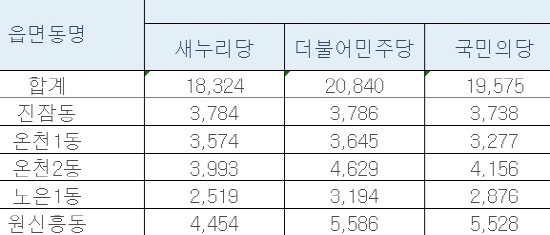 동(洞)별 정당투표 현황을 살펴보면 더불어민주당은 5개 동 지역 모두 수위를 차지했으나 진잠동의 경우, 3당이 3,700표 대에 모두 몰려있어 표를 가늠하기 가장 힘든 곳으로 분석됐다.