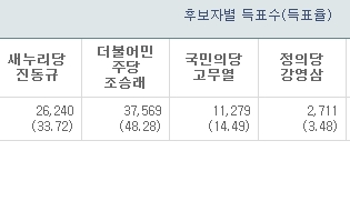 당일투표 투표구별 개표현황에서도 조승래 당선인은 5개 동 투표소 모두 진동규 후보를 앞서며 당선을 확정했다.