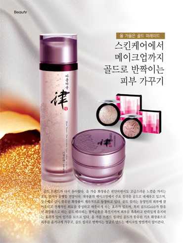 골드로 단장한 피부를 클렌징 할 때도 골드를 이용하자. 금성분은 심신을 편안하게 하고, 피부 노폐물을 제거하는 기능이 있기에, 화장을 지우는