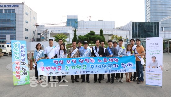 한국농어촌공사 충남지역본부(본부장 김병찬)는 8일 국민연금공단 대전지역본부(본부장 김완수), 한국주택금융공사 대전지사(지사장 채석)와 함께 대전역에서 추석명절을 맞아 「농지연금」,「국민연금」「주택연금」제도에 대한 공동홍보를 펼쳤다고 밝혔다.