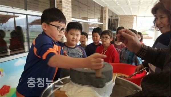 두부 만들기는 학년별로 나눠서 ▲콩을 물에 불린 다음 맷돌에 넣어 갈기 ▲끓인 다음 자루에 걸러내기 ▲콩물을 간수와 섞어 엉기게 한 후 갈린 콩을 두부 틀에 넣기 등의 순으로 진행됐다.