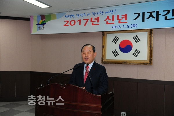 예산군이 5일 군청 제1회의실에서 2017년도 새해를 맞아 신년 기자 간담회를 개최해 올해 군정 운영 방향을 제시했다.