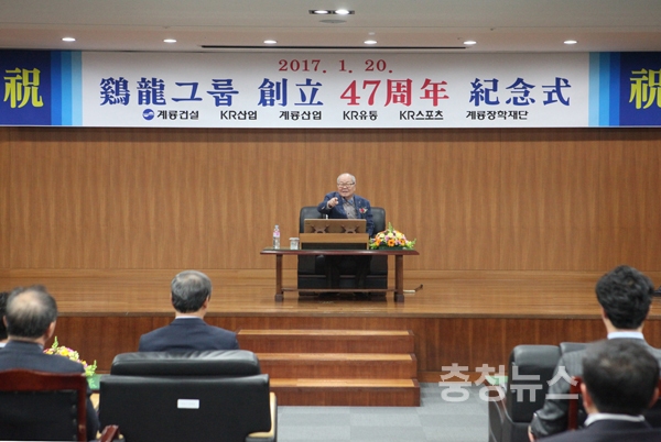이인구 명예회장은 기념사에서 지난 46년 동안 숱한 위기를 극복하고 현재 전국 10위권의 중부권 최대 건설기업으로 서기까지의 계룡건설의 역사를 회고하고 ‘도전・개척・일로매진’의 창업이념을 되새기며 열정과 도전정신으로 웅비의 시대를 열어가자고 주문했다.