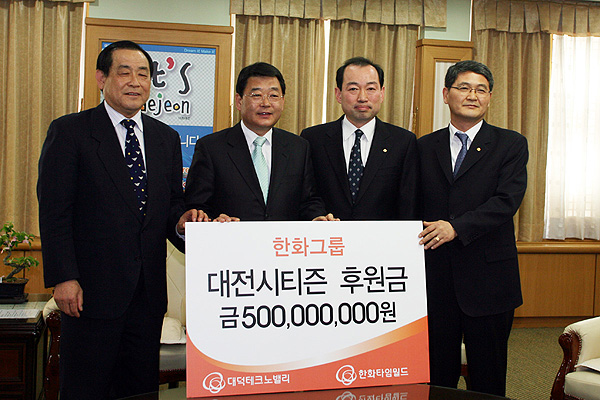 한화그룹 ㈜대덕테크노밸리 정승진 대표와 한화타임월드 양욱대표는 오후 2시 대전시청으로 박성효 시장을 예방하고 이윤원 대전시티즌 사장이 동석한 가운데 대전시티즌에 1년간 5억원의 광고후원을 내용으로 하는 협약식을 가졌다.