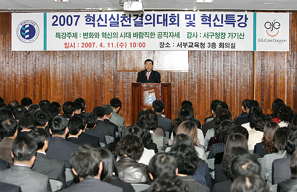 대전광역시 서구 가기산 청장은 11일 오전10시 서부교육청주관으로 실시하는 혁신실천결의대회에 강사로 초빙돼 서부교육청 전직원과 각급 학교 행정실장 등 200여명을 대상으로 혁신실천의지와 혁신내재화의 실현을 위한 혁신특강을 실시했다.