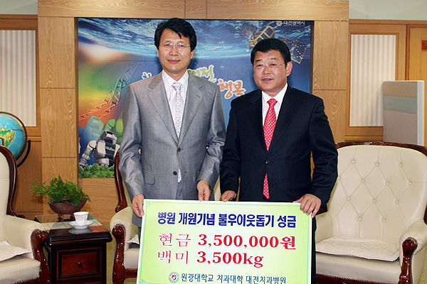원광대학교 치과대학 대전치과병원 민승기 병원장은 7일 오후 2시대전시청으로 박성효 시장을 예방하고 불우이웃돕기에 써달라며 백미 3,500kg과 성금 350만원 등 1,050만원 상당의 성금품을 전달했다.