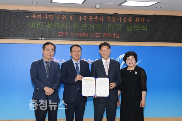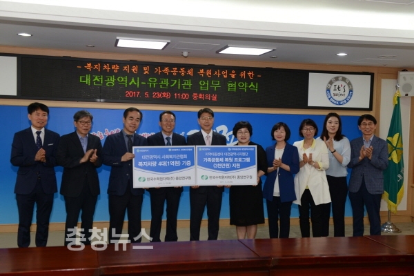 대전시(시장 권선택)는 23일 오전 11시 시청 중회의실에서 한국수력원자력(주) 중앙연구원(원장 이승철), 지역아동센터 대전시지원단(단장 윤종선), 대전광역시사회복지관협회(회장 배영길)와 ‘복지관 노후 차량지원 및 가족공동체 복원사업을 위한 협약식’을 체결했다.