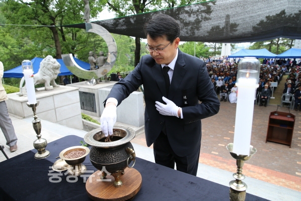 추념식은 오전 10시부터 1분 간 순국선열 및 호국영령에 대한 묵념을 시작으로 헌화와 분향, 복기왕 시장 추념사, 보훈단체협의회장 추도사, 김건배 시인의 헌시 낭독, 현충일 노래 제창 순으로 진행됐다.