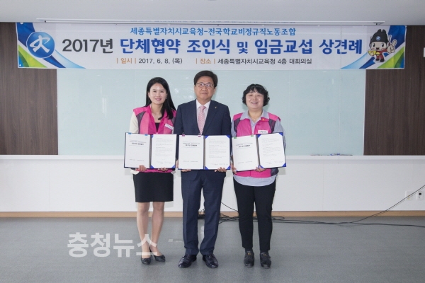 세종시교육청은 8일 교육청 4층 대회의실에서 전국학교비정규직노동조합과 2017년 단체협약을 체결했다. 사진 왼쪽부터 전국학교비정규직노동조합충남세종지부장 여미전, 세종시교육감 최교진, 전국학교비정규직노동조합위원장 박금자 순.